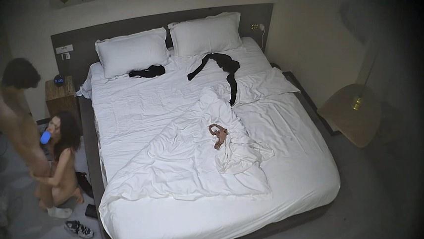 【09】:酒店上帝视角偷拍身材苗条的美女被年轻小伙后入床边前操搞完妹子去洗澡拿她的内裤套头上