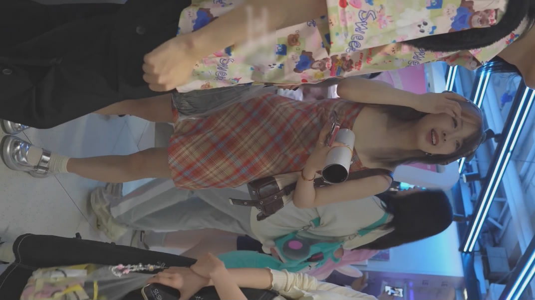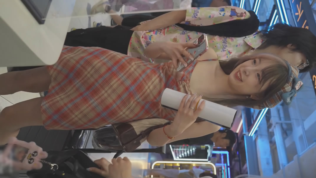 【15】:【banana cat系列】吊带格裙美女逛商场,蕾丝内脸底同框正面黑森林柜台买单的时候内裤被灯光照亮